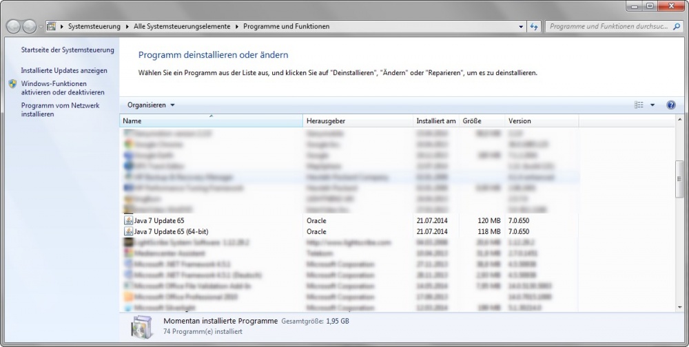 Ansicht Systemsteuerung → Programme und Funktionen unter Windows7 64Bit mit installiertem Java 32 und 64Bit