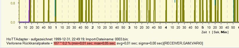Wesentlich schlechter sind die Datenverluste des Rückkanals die bei 22,8% liegen mit einer maximalen Lücke von 5,19 Sekunden. Das ist nicht dramatisch da es nur den Rückkanal betrifft und kann durch einen zweiten Sender in unmittelbarer Nähe oder die Verwendung von Bluetoothgeräten (Headset bzw. Android Gerät) verursacht worden sein, die mit dem Sender BT-Modul gekoppelt sind. Falls einem auffällt das z.B. das Vario sehr verzögerte Wert abgibt ist das unter Umständen ein Effekt der Datenverluste des Rückkanals.