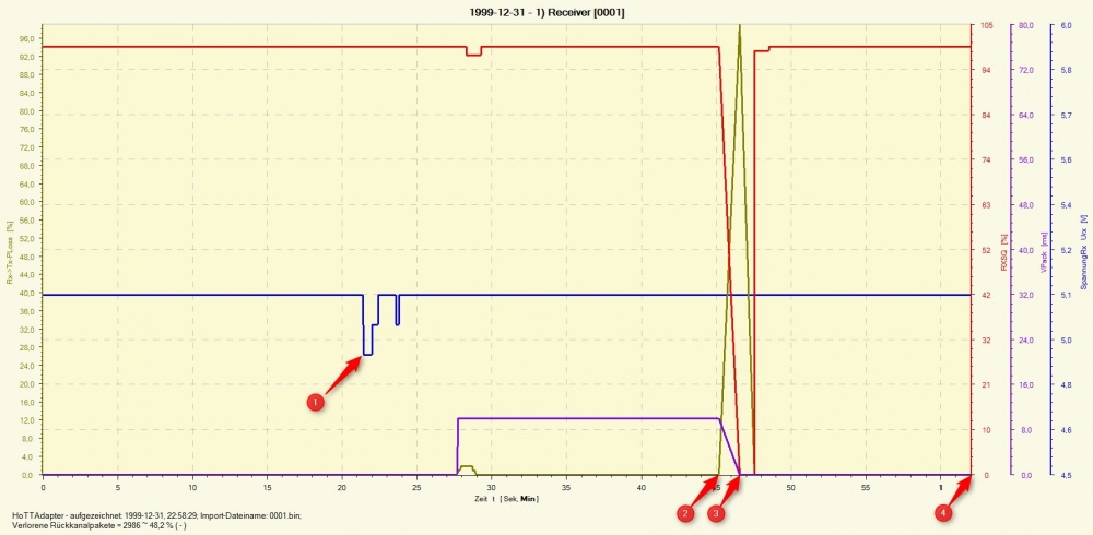 Zur Erläuterung. Der Punkt 1 stellt eine Spannungschwankung durch Servobewegung dar, bei Punkt 4 wurde der Log beendet. An Punkt 2 wurde der RX ausgeschaltet, knapp 1 Sekunde später bei Punkt 3 erfolgt der Neustart. Gut zu erkennen das die Spannung in diesem Fall "gleich" geblieben ist. Das einzige Indiz das der Empfänger Stromlos gewesen sein muss, ist der Neustart der V-Packs die wieder bei Null beginnen und in diesem Fall auch bleiben.