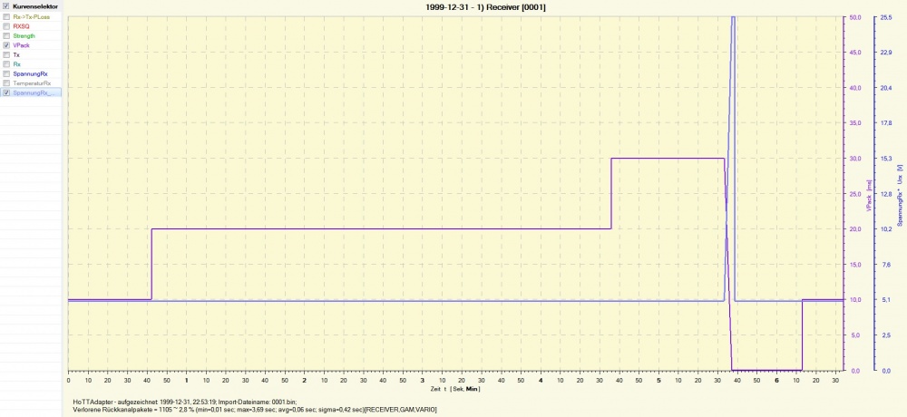 Für Fehlinterpretation beim Auswerten mittels Grafik kann es auch bei der RX Spannung kommen, weil über die Lücke dieser Wert sich nicht verändert hat. Da der VPack Wert den Maximalwert von 2000ms einnimmt und nicht wieder bei Null oder einem besseren Wert beginnt kann man erkennen, dass der Empfänger immer mit Strom versorgt wurde. Wie hoch die Spannung in der Datenlücke war ist nicht zu ermitteln, zumindest immer soviel das der RX keinen Neustart durchgeführt hat.