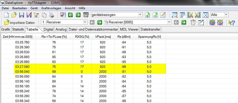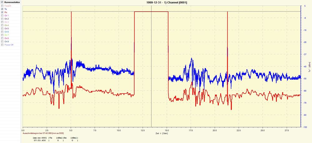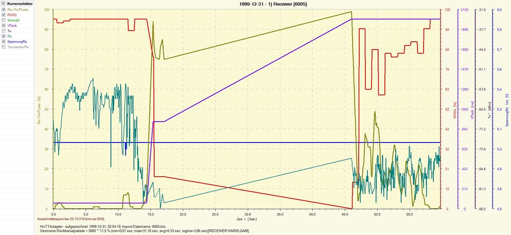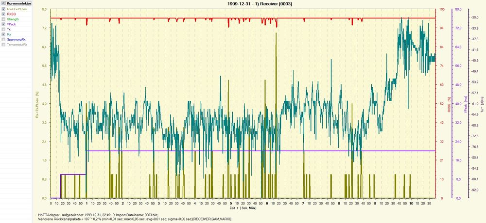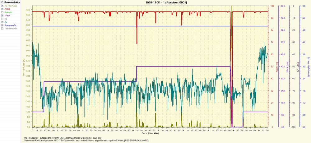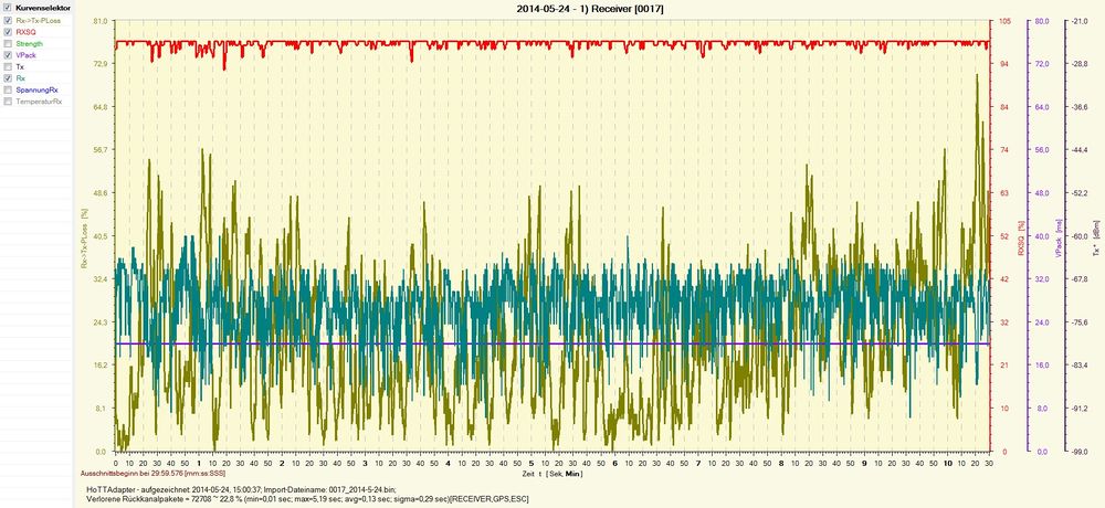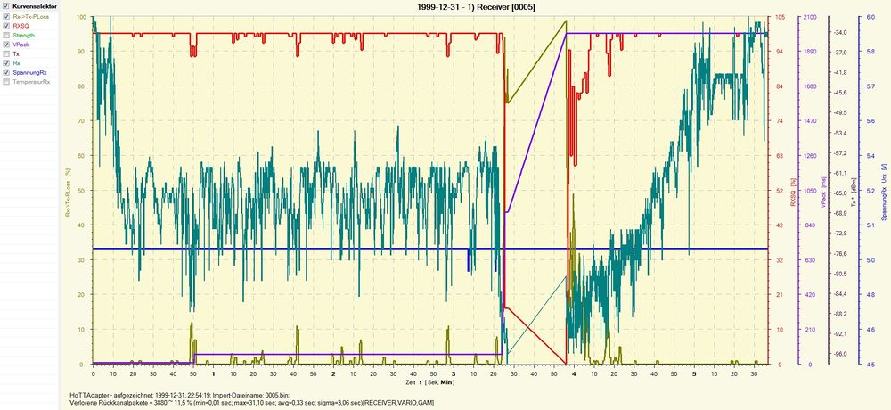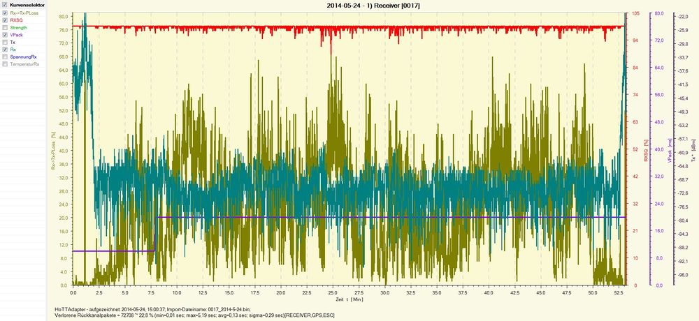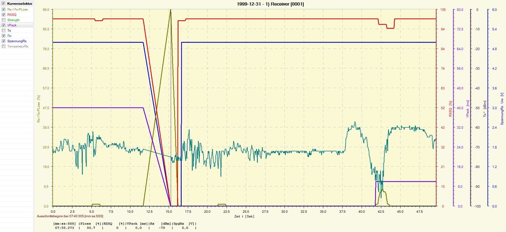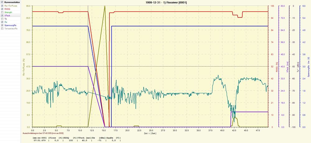 Zur erkennen ist, dass zunächst die wichtigen Empfangswerte sehr schlechte Werte annehmen. V-Pack steigen von 60 auf 920ms, RXSQ fällt von 100 auf 17%, RX Wert fällt ab und schließlich bricht die Übertragung ab. Der TX Wert kann in diese Betrachtung mit einbezogen werden, in der Grafik ist er der besseren Übersicht nicht angewählt.