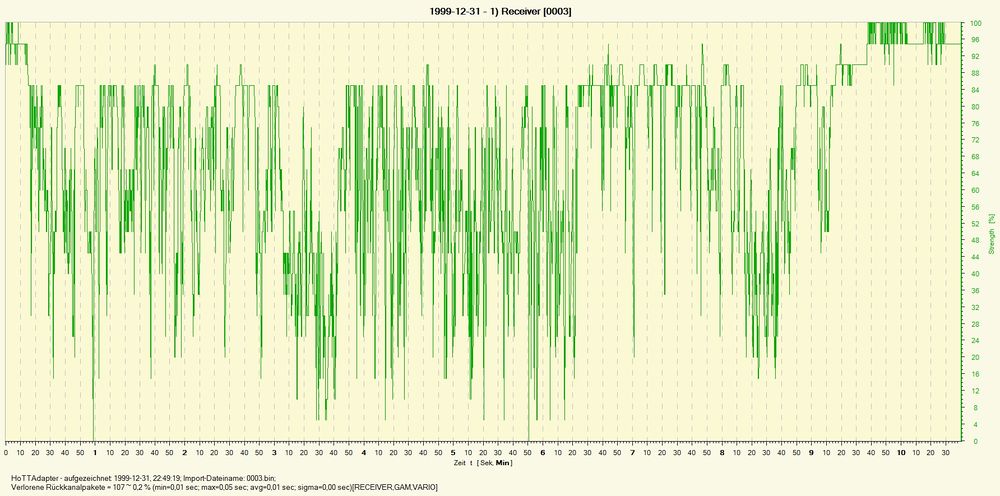 Für den Betrieb einer Modellfernsteuerung ist eine sichere und einwandfreie Funkverbindung zwischen dem Sender und dem Empfänger im Modell der elementar wichtigste Aspekt. Deshalb konzentrieren wir uns hier auf die Auswertung der Empfangsdaten. Als Beispiel wird eine Aufzeichnung verwendet die ein sehr gutes Log darstellt (Abb. 1).