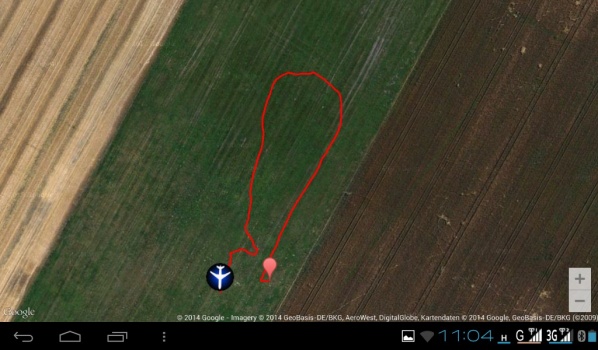 In der DataExplorer App sieht das so aus, grüner Marker Startpunkt, roter Marker da sollte der Flieger liegen und der blaue Pfeil ist die Richtung in der sich das Androidgerät bewegt also der eigene Standpunkt.